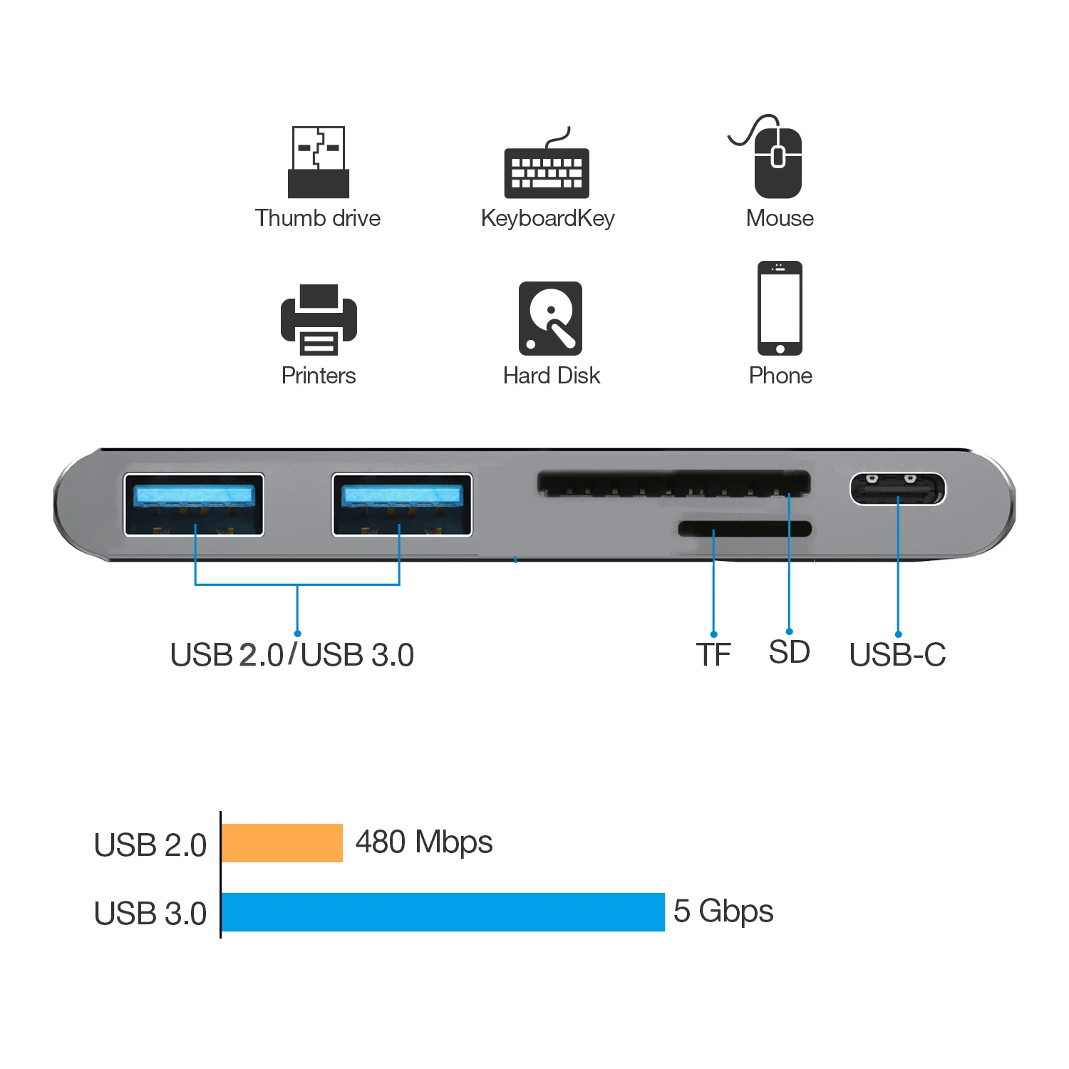 - 5-in-1 Model: Features PD, SD, TF, one USB 3.0, and one USB 2.0 port.