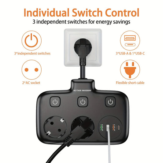 EU AC Plug Power Strip | Wall Mounted | Independent Switch | Multitap | Network Filter | USB C Charging | Network Filter Adapter