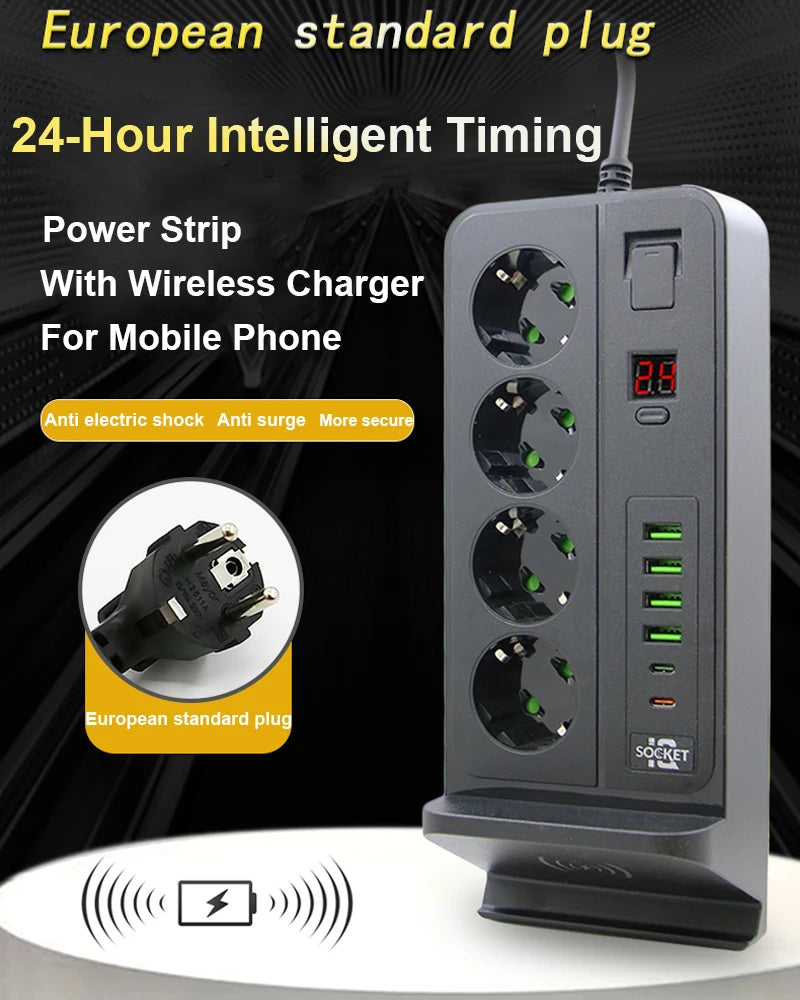 "Power Strip with Wireless Charger and 24-Hour Smart Timer"