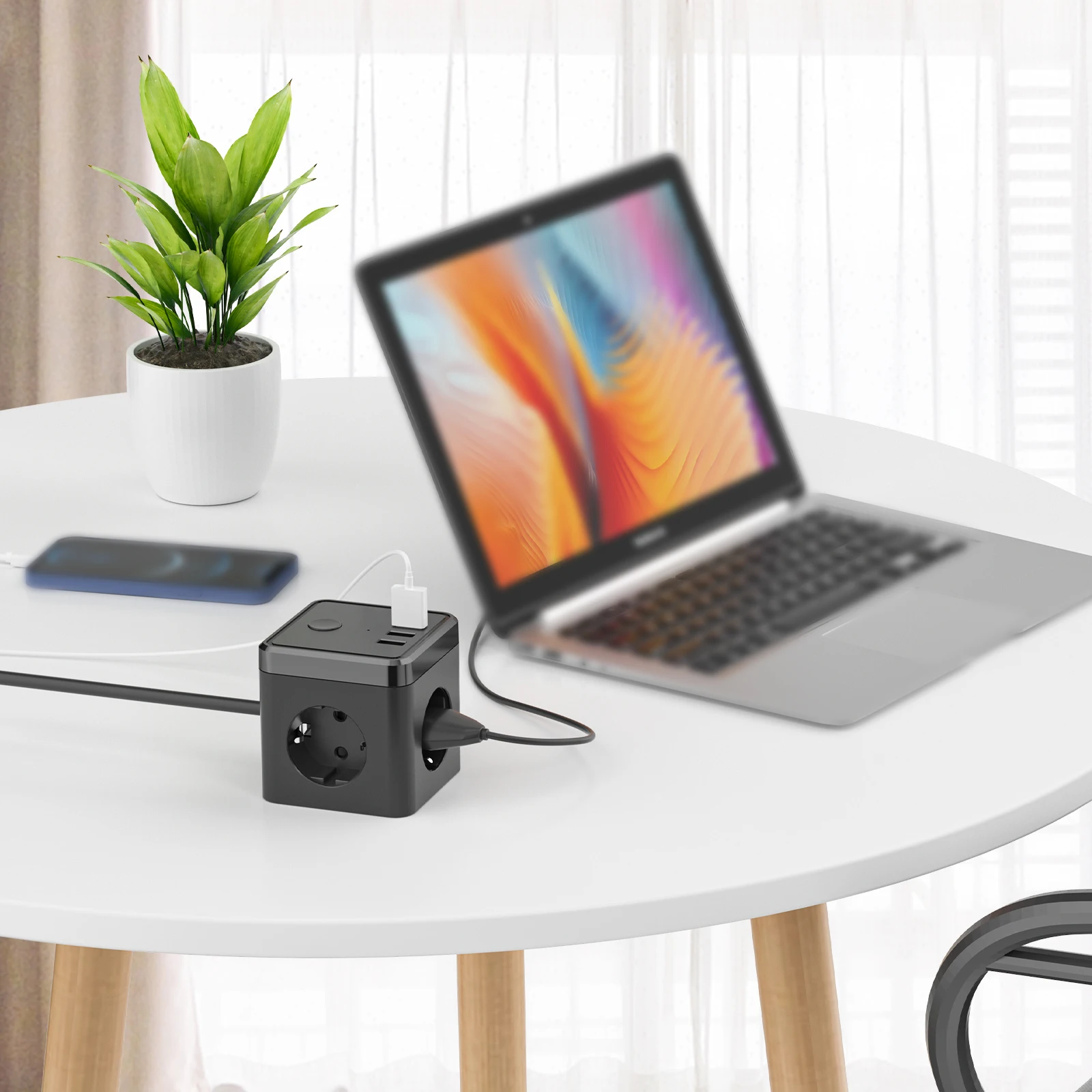Product Name: Cube Multiple Socket With USB Fast Charging Port,3-way Socket With Switch, 2 Euro And 1 Schuko Socket for Home Bedroom Office