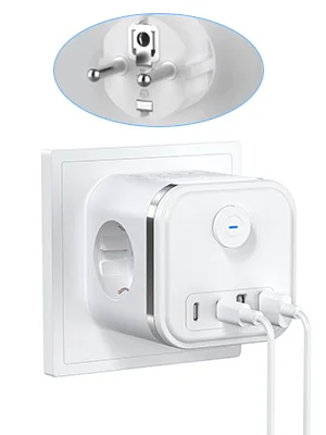European plug wall socket power strip with 3 AC outlets, 2 USB and 2 Type-C ports fast charging extender with indicator switch